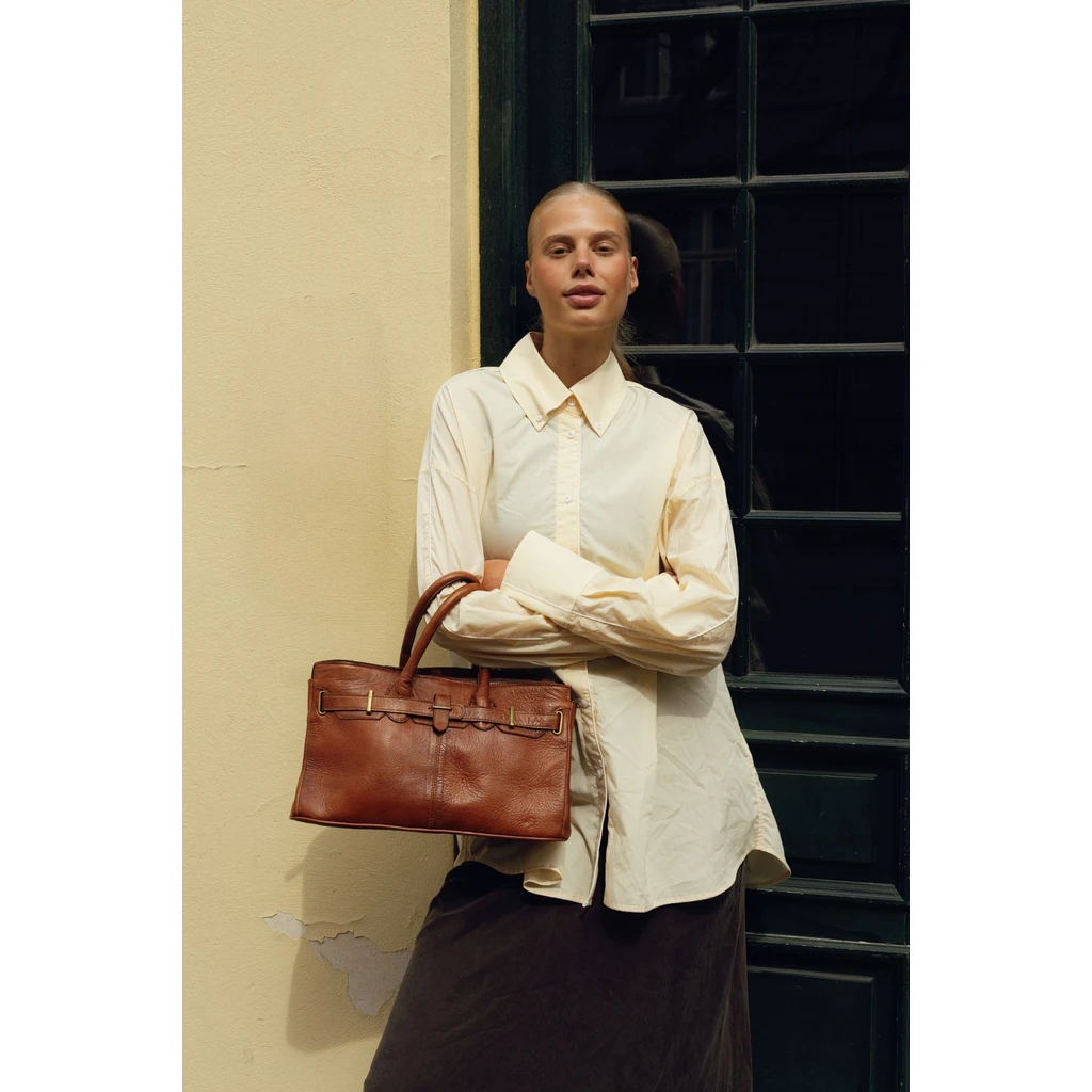 Beskrivelse The Mada Small is a chic and versatile handbag designed with both style and functionality in mind. It features two top handles, allowing you to carry it by hand, and comes with a detachable, adjustable crossover strap for added flexibility. Eye-catching buckle details on the front add a touch of elegance and character to the design. Inside, you'll find a spacious main compartment with plenty of room for your daily essentials. A perfect blend of practicality and timeless charm. Made in our Urban leather quality - a natural milled cow leather, where each bag is processed and dyed before the surface has been finalized, which keeps the original grain pattern of the raw leather. After the bags have been dyed, light wax is applied by hand, leaving a smooth and soft finish with unique features. NOTE: This order contains a FREE TOTE BAG |