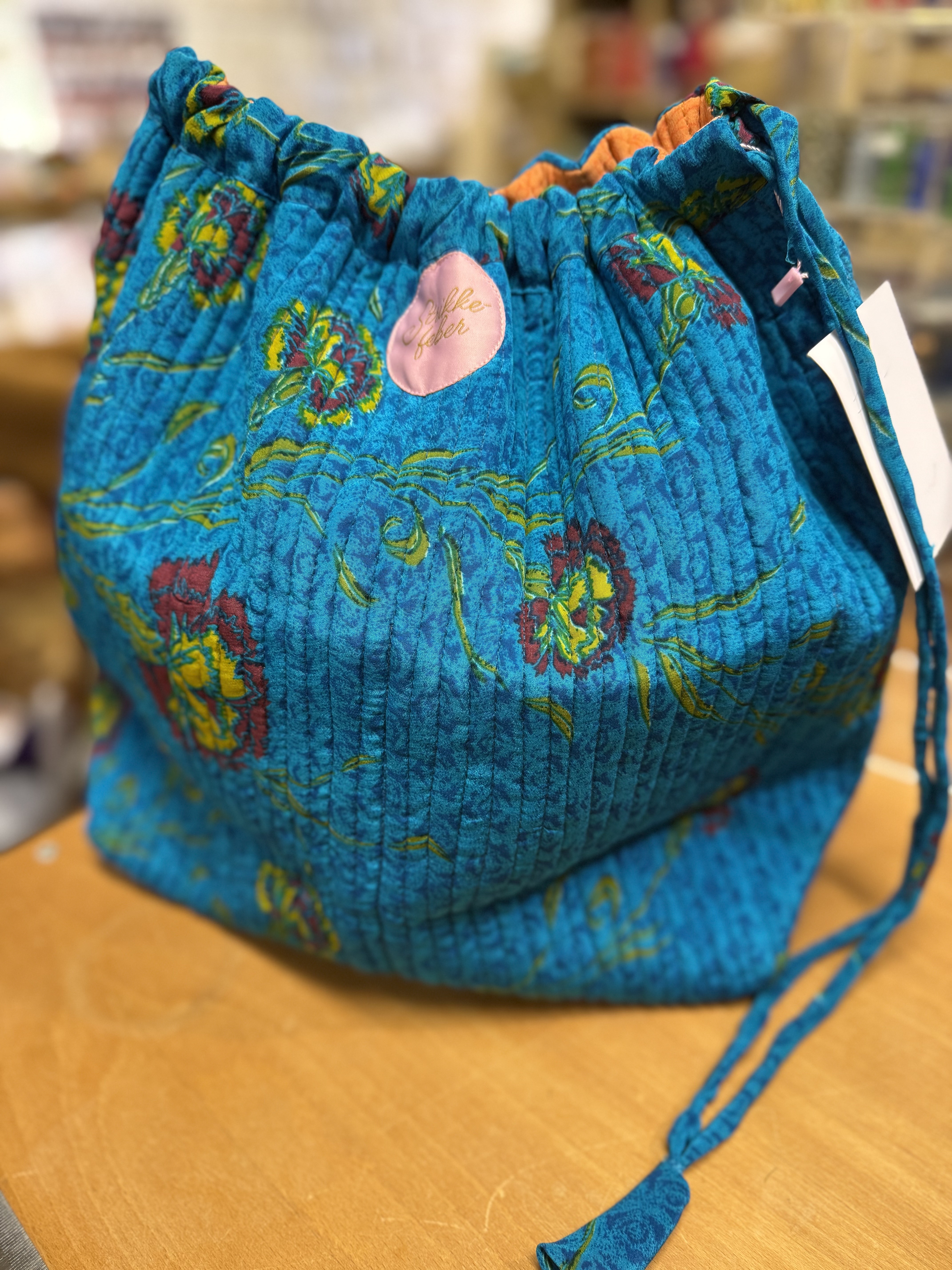 Beskrivelse Prosjektbag lagent av vintage silke sarees. Bagen er quilted. På innsiden har den 2 lommer på den ene siden, og 4 små lommer på den andre siden. Praktisk til oppbevaring av strikkestæsj og pinner. Den er 43 cm bred og 33 cm høy. Bagen rommer et stort strikketøy og lukkes med å trekke i snorene på toppen. Du kan brette den ned som en kurv slik at du har kontroll på garnet mens du strikker. Bagen er super til all slags håndarbeid og kan også brukes som toalettmappe eller annen oppbevaring |