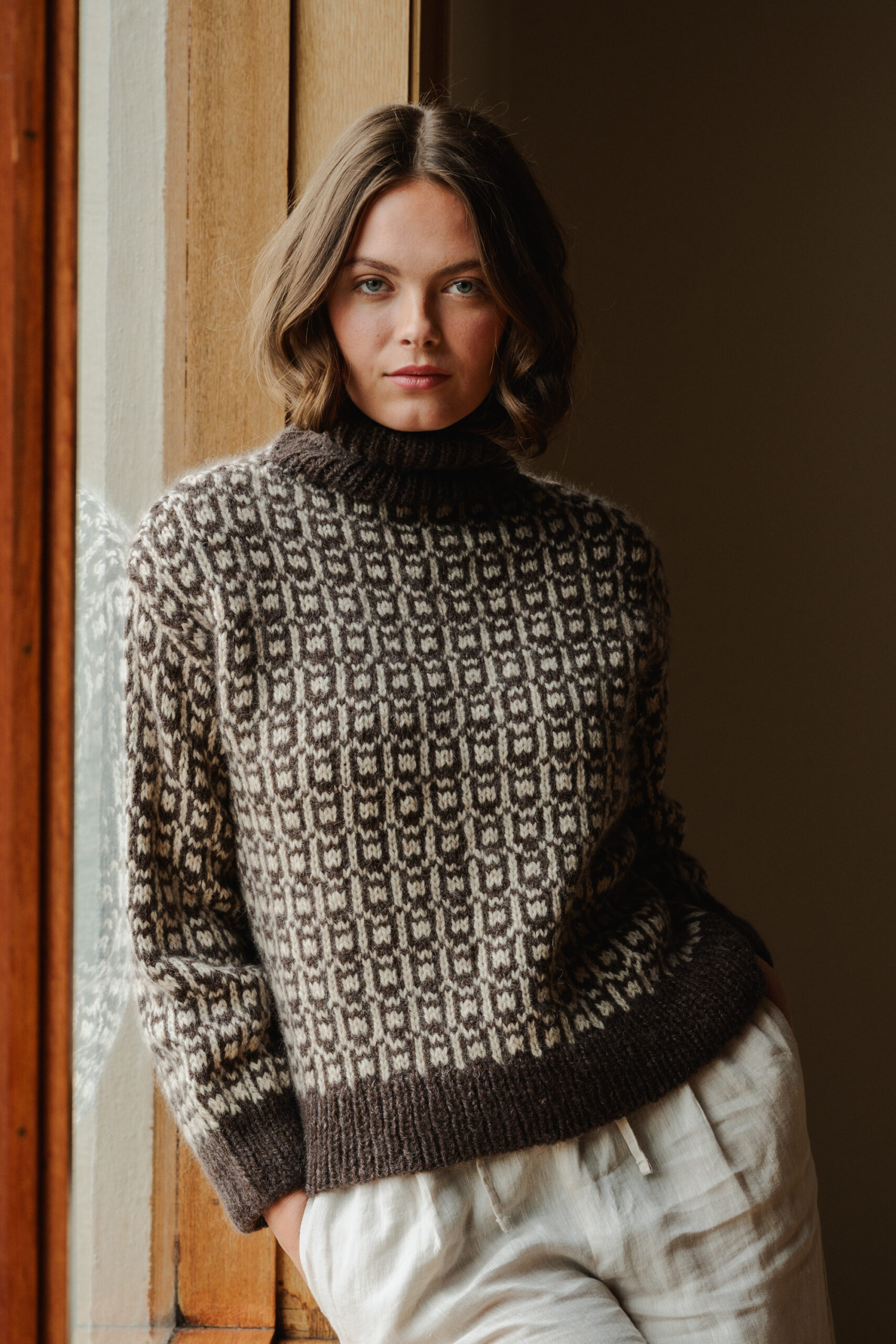 Genseren strikkes rundt nedenfra og opp i mønstret glattstrikk, med brede kanter og høy brettet halskant i ribb. Genserens mønster strikkes etter diagrammer.