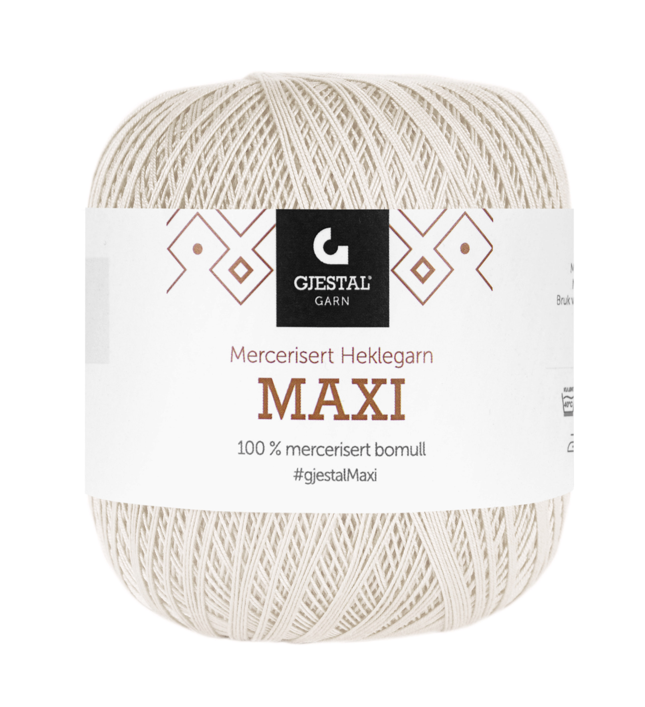 Beskrivelse Maxi Heklegarn er et 100% mercerisert bomullsgarn som egner seg til ypperlig til klassiske, heklede duker, løpere, puter, sengetepper, gardinkapper, kunststrikkede duker og heklede border samt heklede og strikkede handlenett. Heklenål: 1,25-1,5 mm. 100 g = ca. 650 m. |