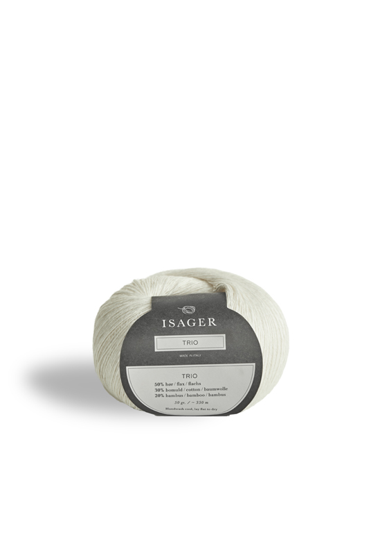 Beskrivelse ISGER TRIO 1 består af 50 % Hør, 30 % Bomuld og 20 % Bambus. Garnet kan strikkes alene, med en, to, tre eller flere tråde, eller det kan strikkes sammen med de øvrige garnkvaliteter. |